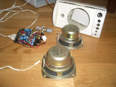 Jag valde att använda ett par standard PC högtalare, vilka jag plockade isär. Nu kunde jag flytta volymkontrollen till valfritt ställe på kabinettet och anslutningen till PC:n var klar. Det går naturligtvis att använda andra typer av högtalare, tex. bilhögtalare, men då måste du köpa någon slags kort med volymkontroll och anslutning till PC. Sådana kort finns att köpa på lite olika ställen på Internet, tex. Happ controls. Om du väljer att använda andra högtalare än PC högtalare skall du tänka på att de skall vara skärmade. Om man använder oskärmade högtalare finns det risk att magnetfältet i högtalarna påverkar monitorns bild. Bilden kan bli förvrängd.